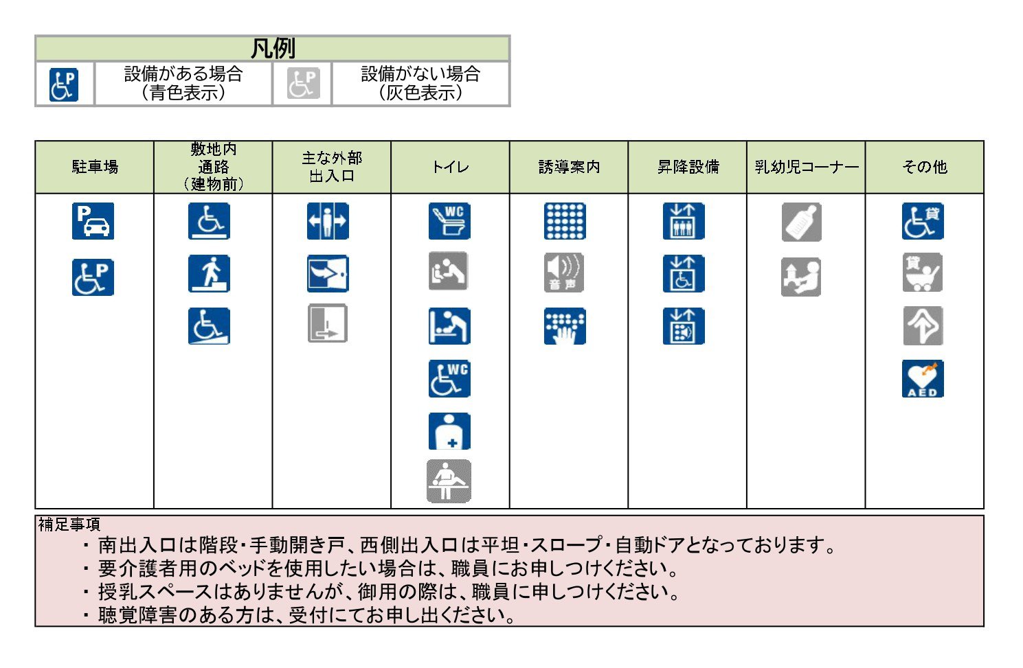 AED、貸出用車椅子を備えています。